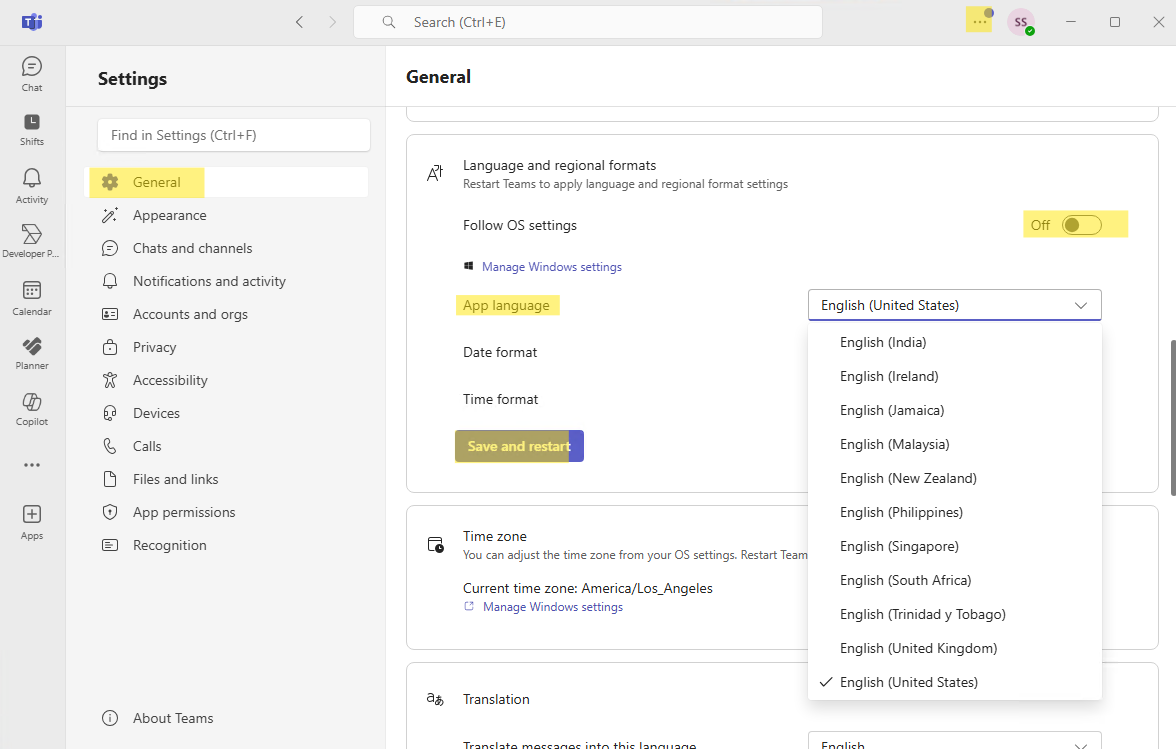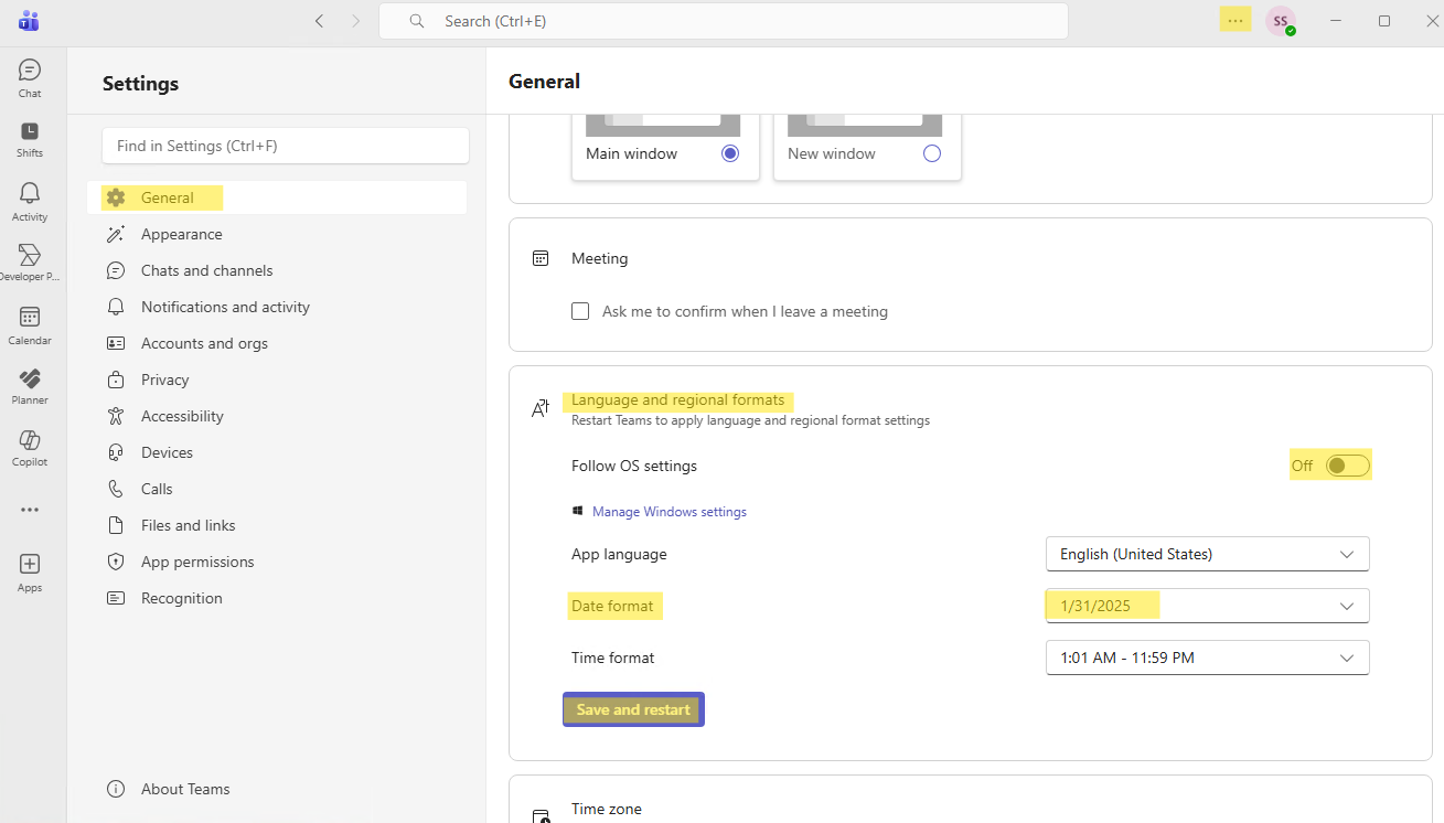 - Choose App language, Date format, and Time format, then restart Teams if prompted.