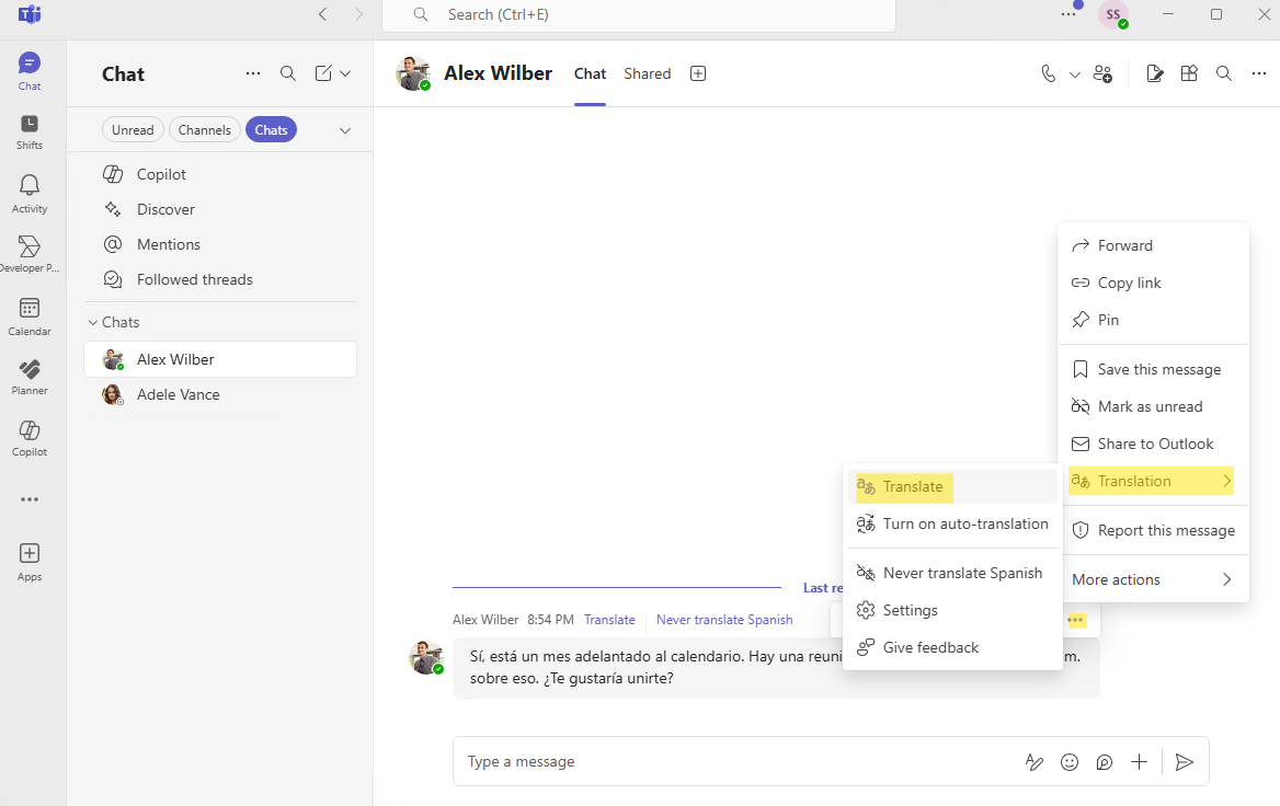 - To adjust translation preferences or turn off automatic translation, select Translation options on any translated message, then go to Settings > Translation.