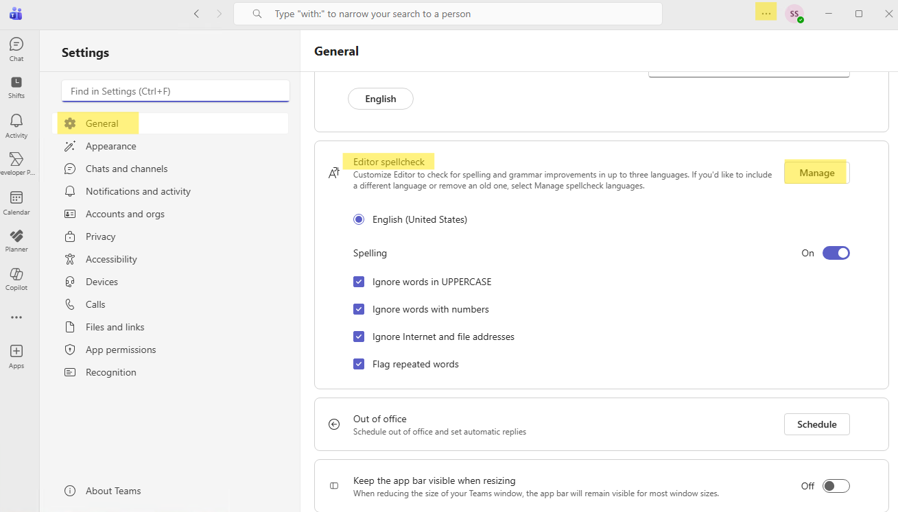 - In General, open Editor Spellcheck and select Manage to add languages. Teams will suggest corrections based on the languages you choose.