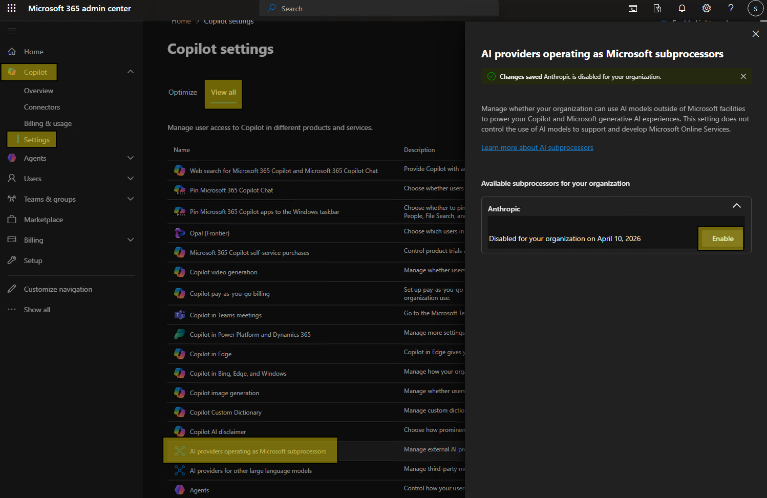 For most commercial tenants, Anthropic is now enabled by default. You do not need to do anything to turn it on. The exception is EU, EFTA, and UK regions, where it is off by default due to data residency requirements.