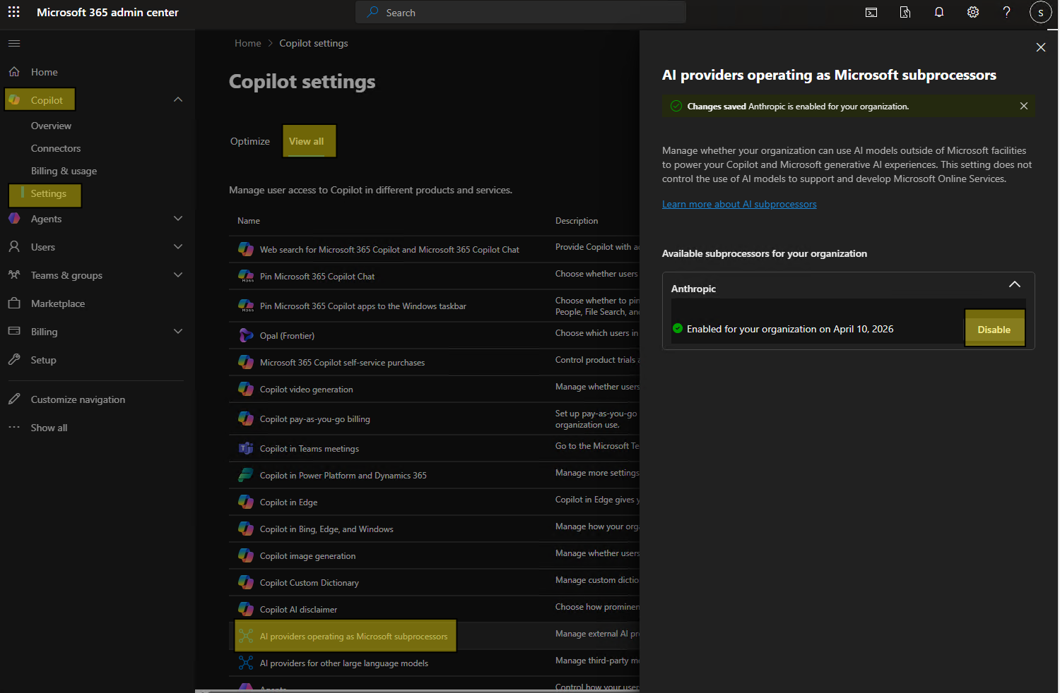 At the time of writing, the Anthropic setting is tenant-wide. Either all licensed Copilot users can access Claude or none of them can. However, Microsoft has announced that group-based controls are coming, which will let admins enable or disable Anthropic for specific users or Entra ID groups. This is expected to roll out in late April 2026.
