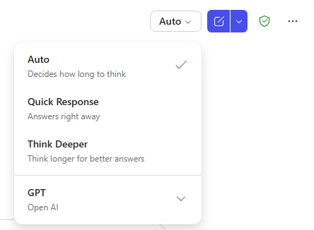 - Click the model selector (look for the model name near the chat input box) to switch between Auto, Quick Response, and Think Deeper.