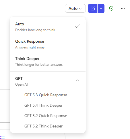 - Think Deeper (GPT-5.4 Thinking): Takes more time to reason through complex problems before responding. Good for long documents, multi-step analysis, or nuanced tasks where you want the most thorough result possible.