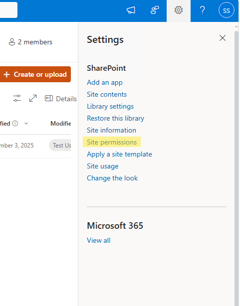 - Select the gear icon, then Site permissions (for site level).