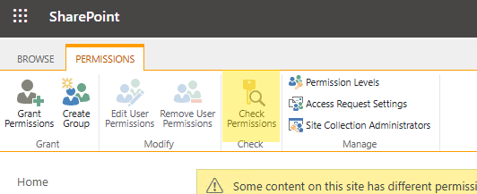 - In the permissions page, select Check Permissions in the ribbon.