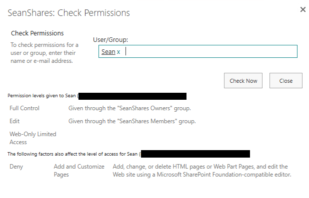 SharePoint returns the exact permission level that user has and which group or direct assignment is responsible for it. This is the fastest way to answer the question "why can this person see this?" or "why can't this person edit that?"