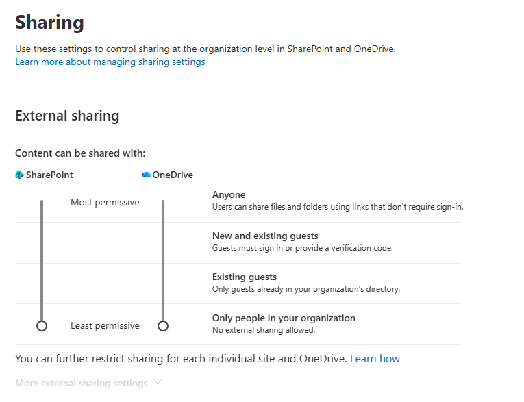 The tenant-level setting has four options, ranging from most to least permissive: Anyone, New and existing guests, Existing guests only, and Only people in your organization. Most business environments run on New and existing guests or Existing guests only, which require external users to authenticate before accessing content.